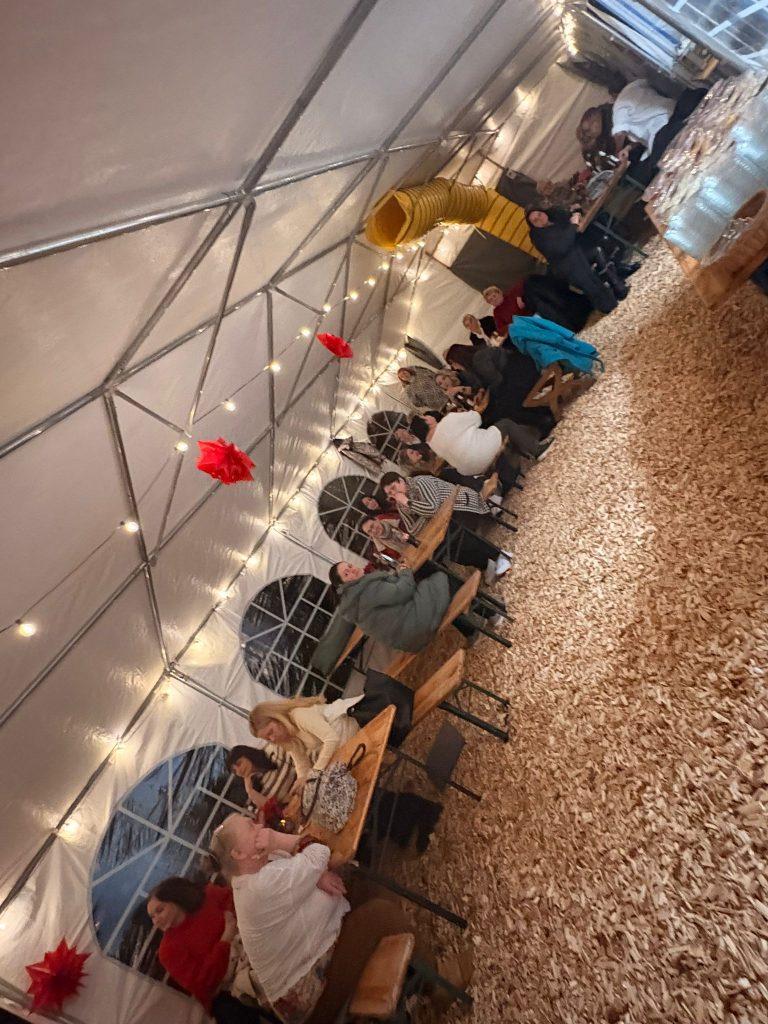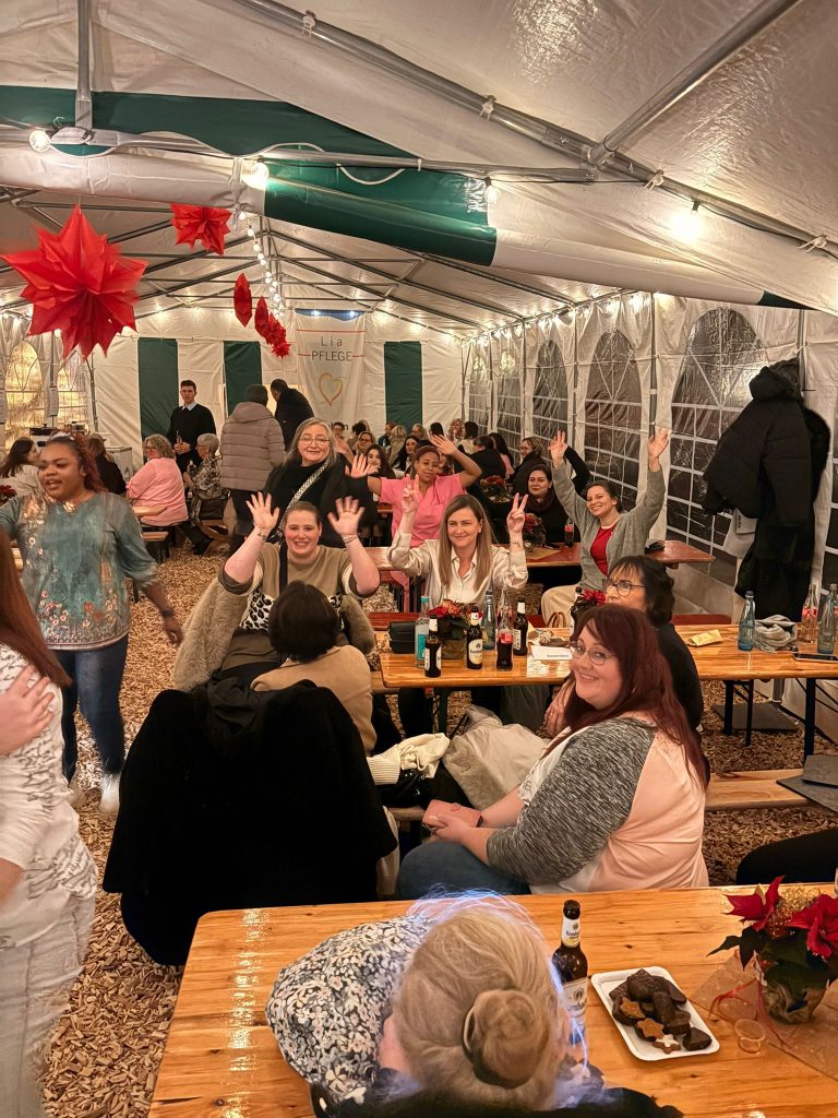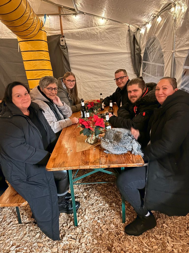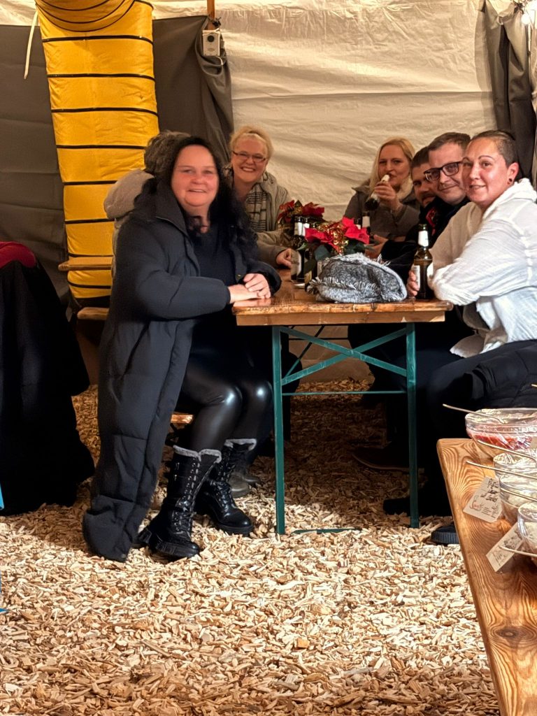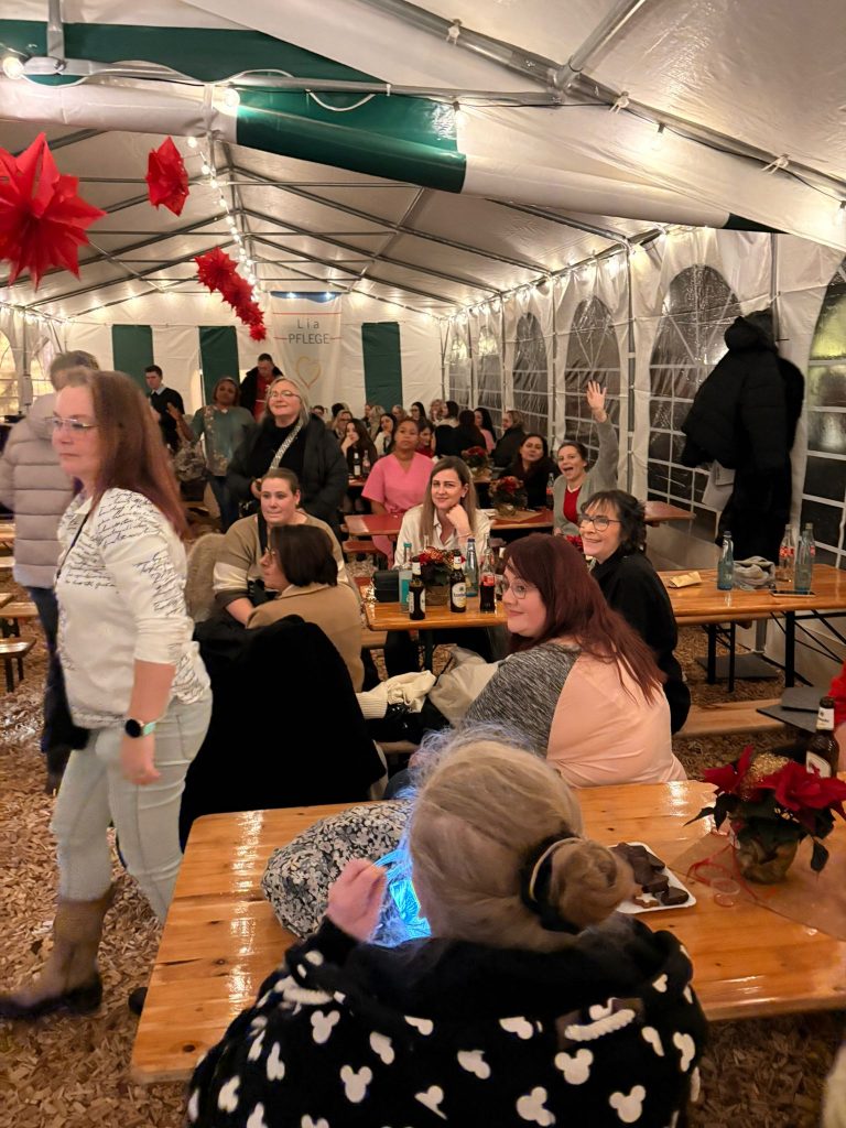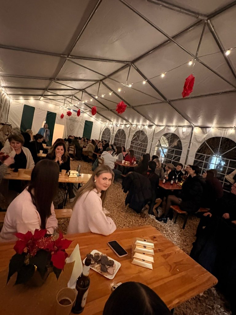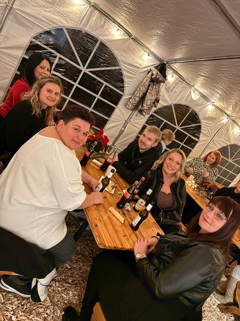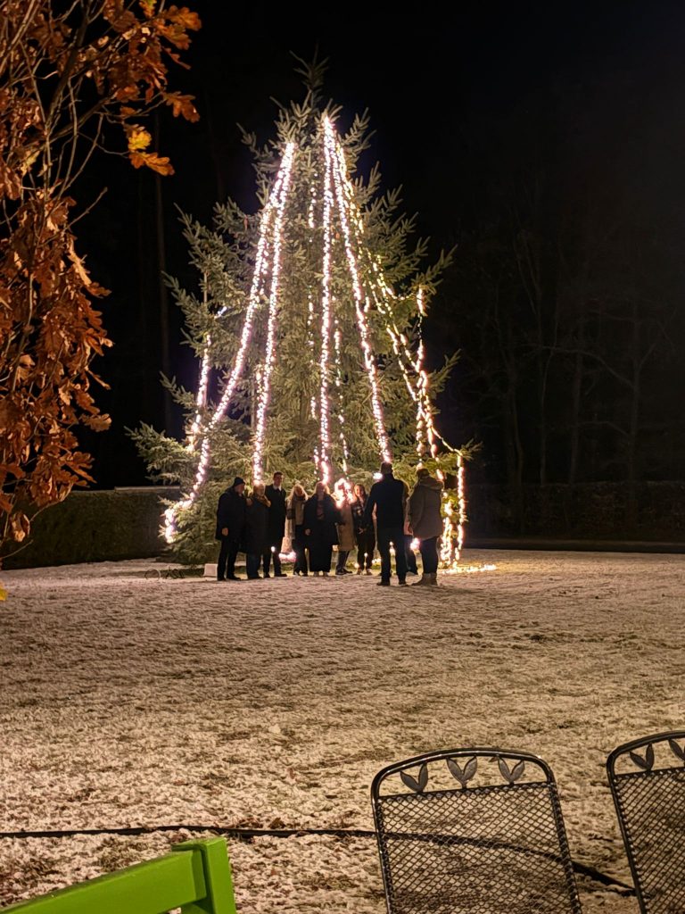 Draußen erwartete unsere Gäste ein echtes Highlight: Ein großer, festlich beleuchteter Weihnachtsbaum, der sich schnell zu einem beliebten Selfie-Spot entwickelte. Währenddessen sorgten unsere engagierten Hausmeister am Grill für köstliche Leckereien. In den beheizten Zelten wurde anschließend in gemütlicher Atmosphäre gemeinsam gegessen, gelacht und gefeiert.