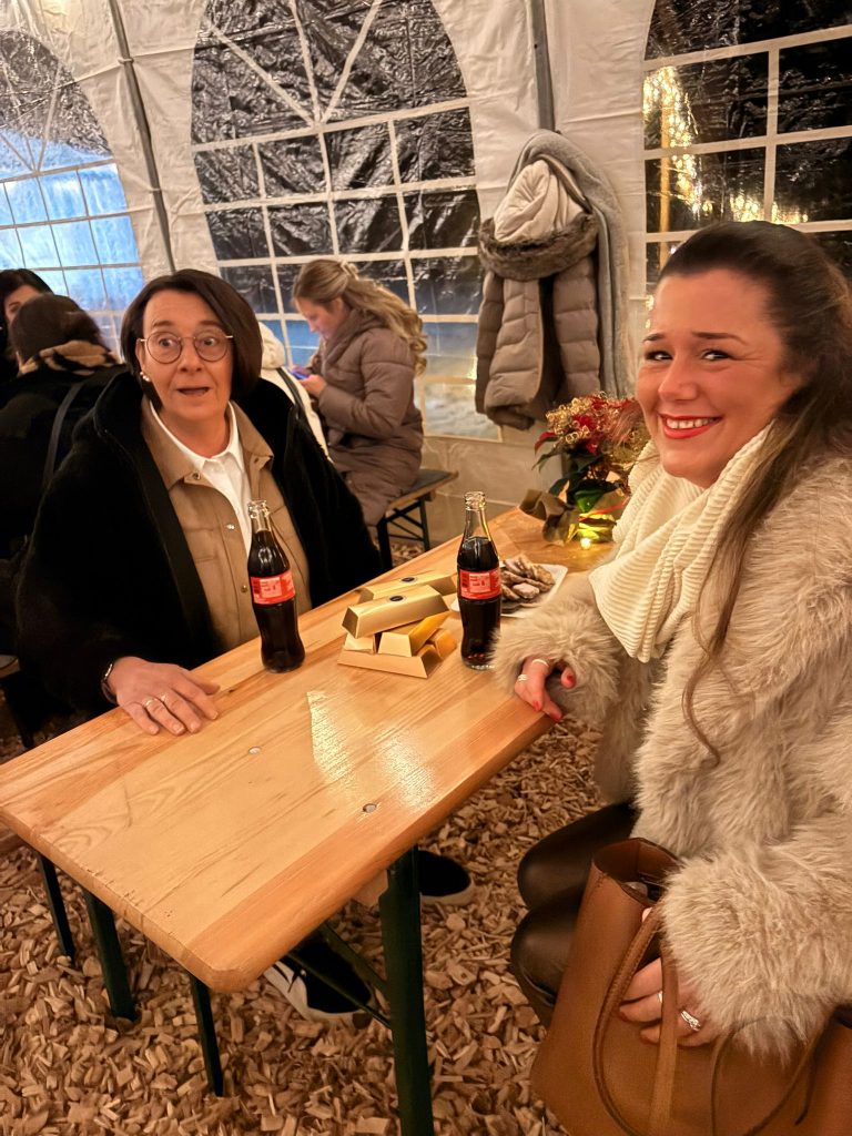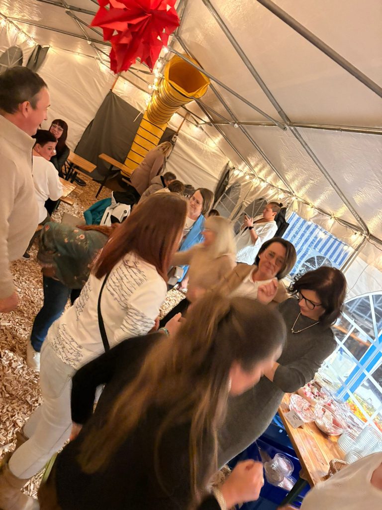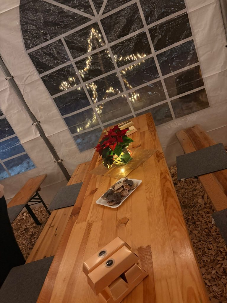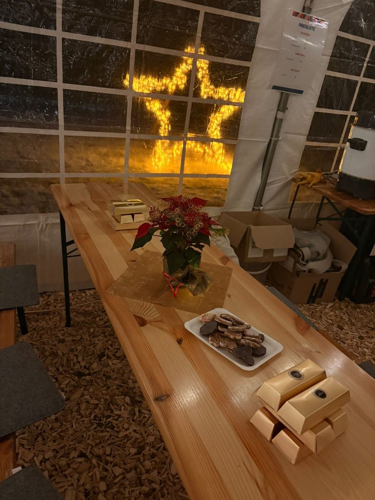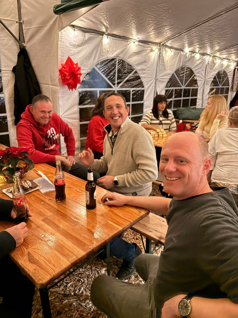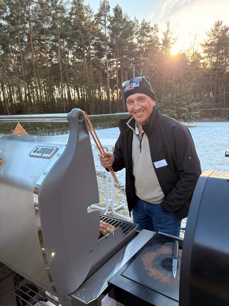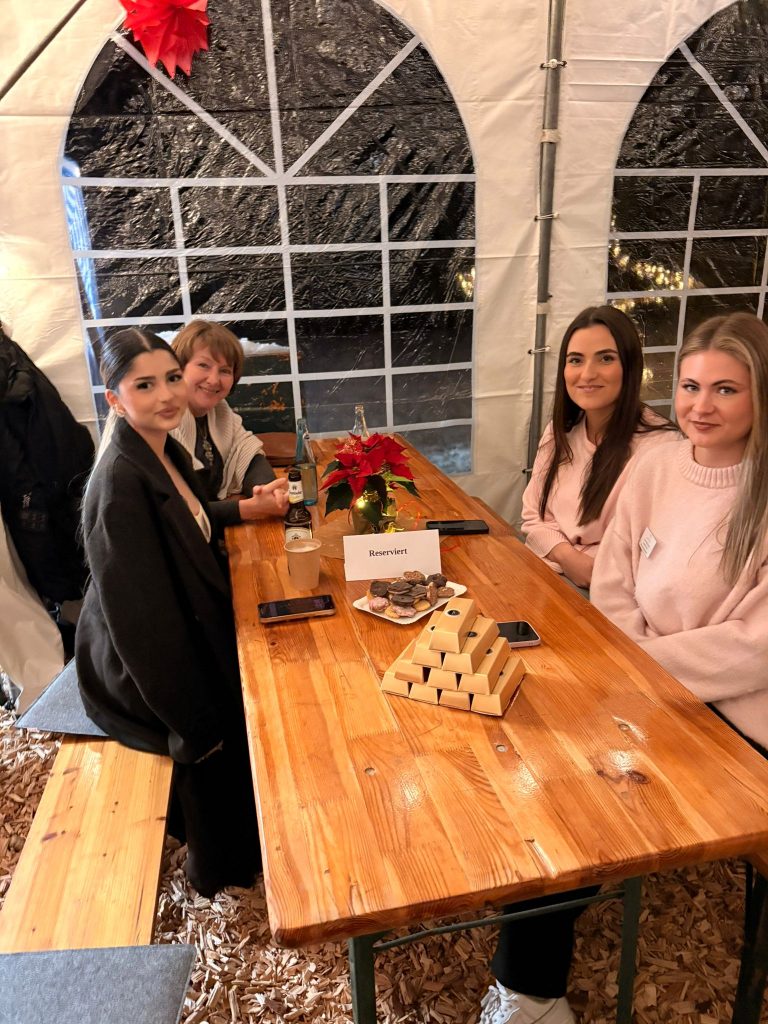 Draußen erwartete unsere Gäste ein echtes Highlight: Ein großer, festlich beleuchteter Weihnachtsbaum, der sich schnell zu einem beliebten Selfie-Spot entwickelte. Währenddessen sorgten unsere engagierten Hausmeister am Grill für köstliche Leckereien. In den beheizten Zelten wurde anschließend in gemütlicher Atmosphäre gemeinsam gegessen, gelacht und gefeiert.